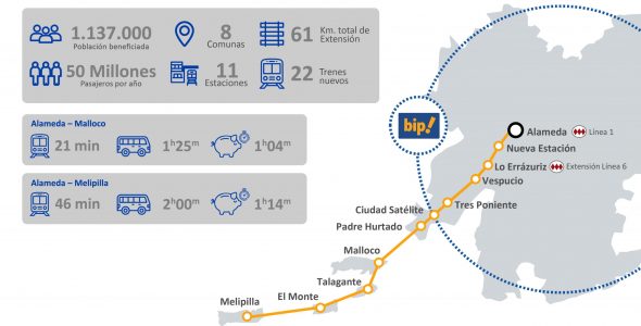 Por último, el principal beneficio para los futuros pasajeros será la disminución de los tiempos de viaje. Actualmente, el recorrido desde Estación Central a Melipilla tarda cerca de dos horas. Una vez que se implemente el tren, el tiempo de viaje será aproximadamente de 46 minutos.