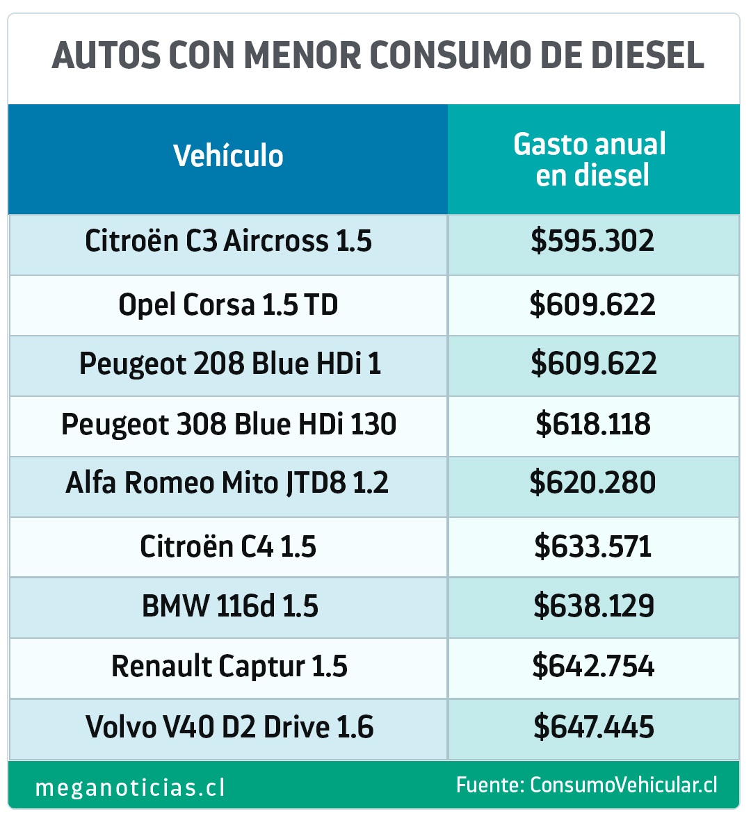 Por otro lado, también considerando un gasto con 20 mil kilómetros anuales, pero a diesel, los que tienen un consumo inferior son: