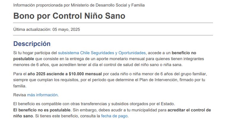 Se trata del Bono Control Niño Sano, beneficio que se entrega a quienes pertenezcan al subsistema indicado anteriormente y tener acreditada la rendición de los controles. Además, es necesario cumplir con los siguientes requisitos: