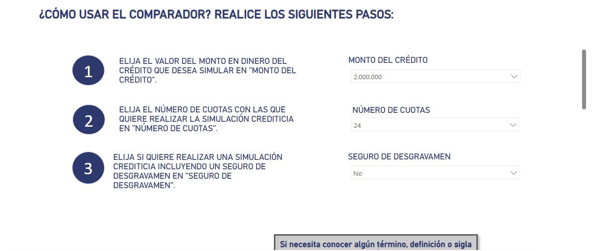 La plataforma ofrece simulaciones que incluyen el valor de la cuota mensual, la tasa de interés, la Carga Anual Equivalente (CAE) y el Costo Total del Crédito (CTC), entre otros indicadores. De esta manera, las personas pueden evaluar cuál alternativa se ajusta mejor a su presupuesto antes de contratar el crédito.