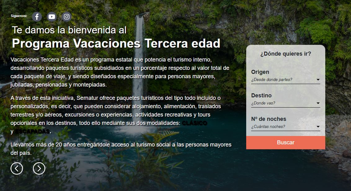 El Servicio Nacional de Turismo (Sernatur) impulsa el programa “Vacaciones Tercera Edad”, una iniciativa que busca fomentar el turismo interno mediante paquetes turísticos subsidiados en un porcentaje del valor total.