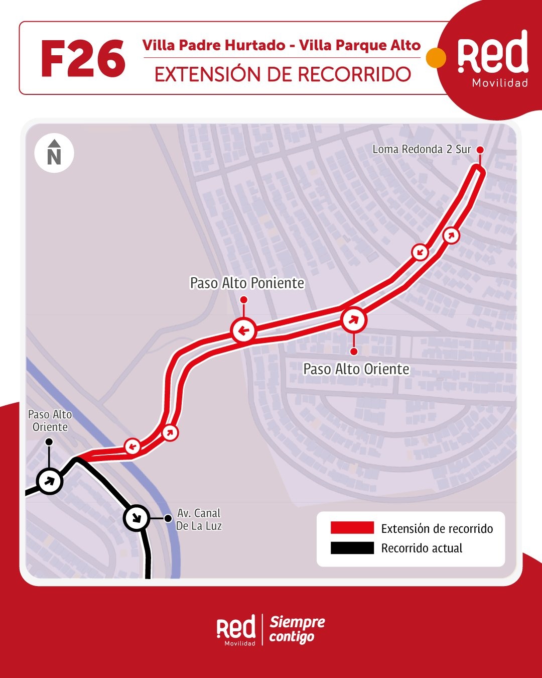 En la misma comuna del sur de la capital, el servicio F26 modificó su trazado en la Villa Parque Alto, extendiéndose al oriente por Paso Alto hasta llegar a Loma Redonda 2 Sur.
