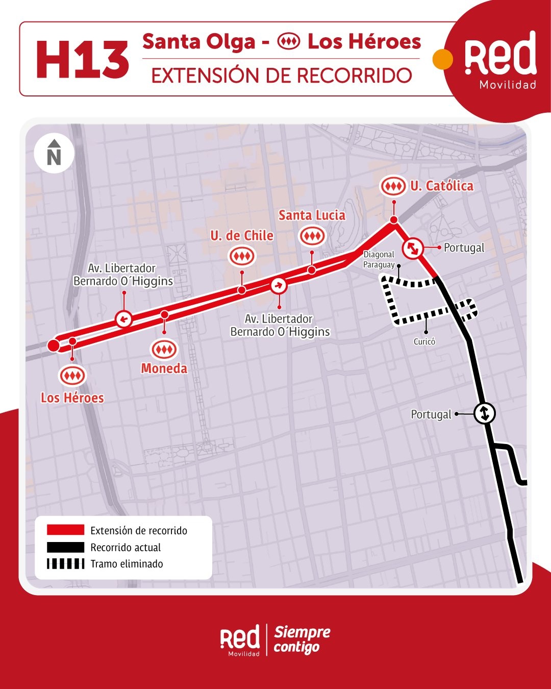 El primero de los cambios es la extensión del recorrido H13, el cual ahora llegará hasta la estación Metro Los Héroes al incorporar nuevas paradas en Av. Portugal y la Alameda.