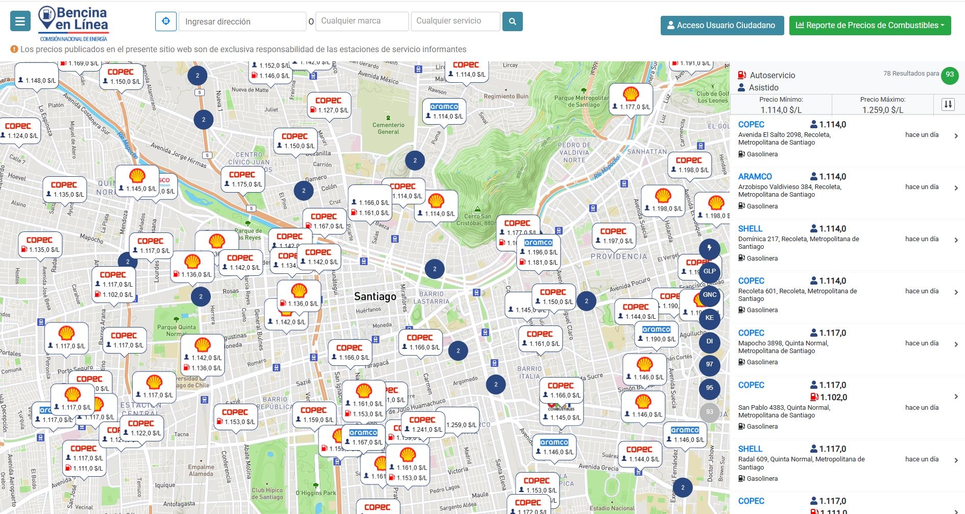 La Comisión Nacional de Energía tiene un sitio web con un mapa interactivo en donde arroja la marca de la bencinera, los precios que tiene, su ubicación exacta, los métodos de pago que aceptan, entre otros datos relevantes.