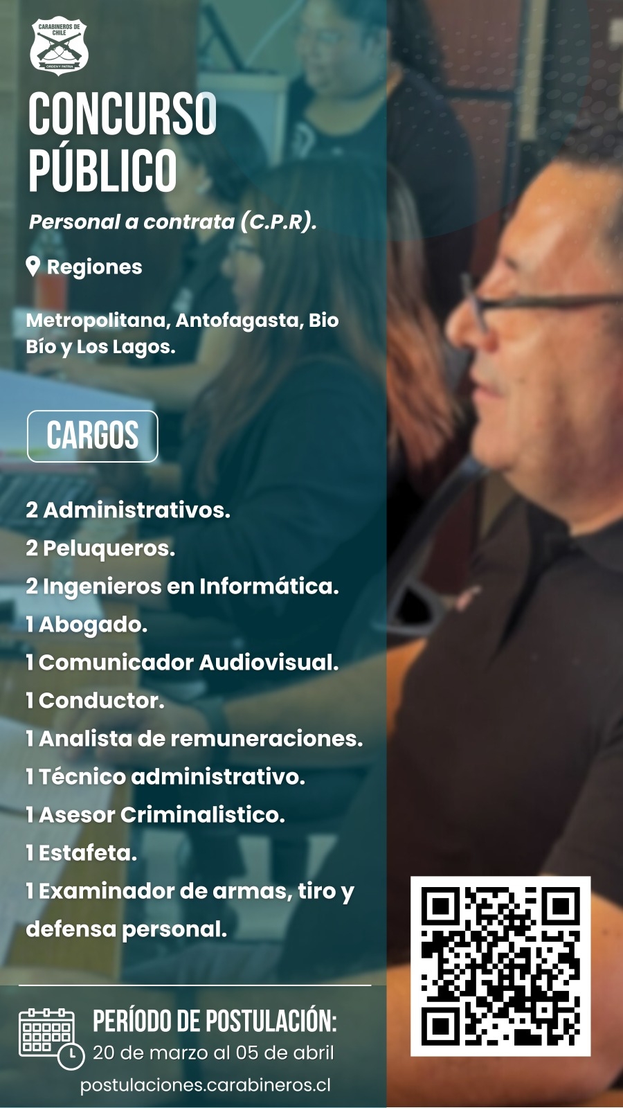El proceso se realizará exclusivamente a través de los canales oficiales de Carabineros de Chile, donde los interesados podrán revisar los requisitos específicos de cada cargo y completar su postulación en línea.