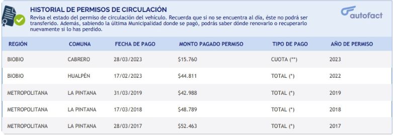 Pese a que las municipalidades no poseen un sistema público ni centralizado para verificar dónde se verifique el lugar de pago del permiso de circulación de un auto o motocicleta, la plataforma Autofact, si cuenta con esa información, en la mayoría de los casos.