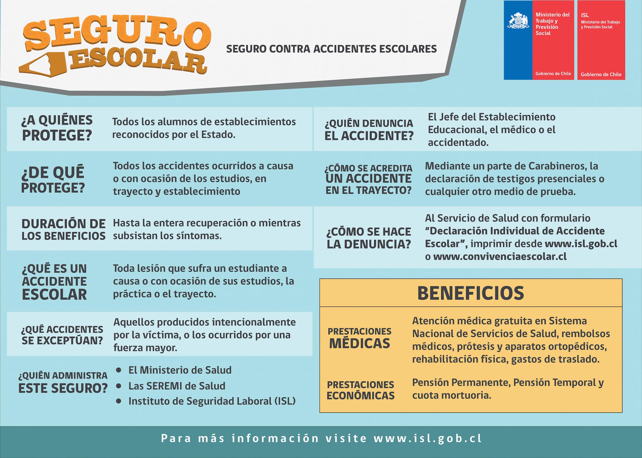 Este beneficio se activa al momento que el estudiante sufra un accidente a causa o con ocasión de sus estudios, mientras realiza la práctica, en el trayecto directo, de ida o regreso, entre su casa y el establecimiento educacional; y protege a todos los alumnos regulares de establecimientos fiscales, municipales, particulares subvencionados, particulares no subvencionados; de nivel transición de la educación parvularia, de enseñanza básica, media, normal, técnico, agrícola, comercial, industrial, universitaria e institutos profesionales dependientes y reconocido por el Estado.