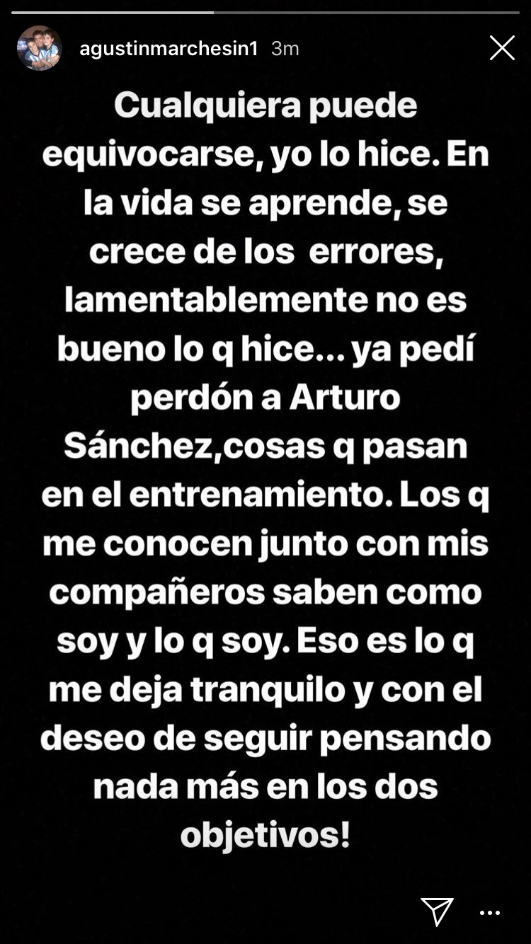 "Cualquiera puede equivocarse, yo lo hice. En la vida se aprende, se crece de los errores lamentablemente no es bueno lo que hice… ya pedí perdón a Arturo Sánchez, cosas que pasan en el entrenamiento. Los que me conocen junto con mis compañeros saben cómo soy y lo que soy. Eso es lo que me deja tranquilo y con el deseo de seguir pensando nada más en los dos objetivos", expuso Marchesín.