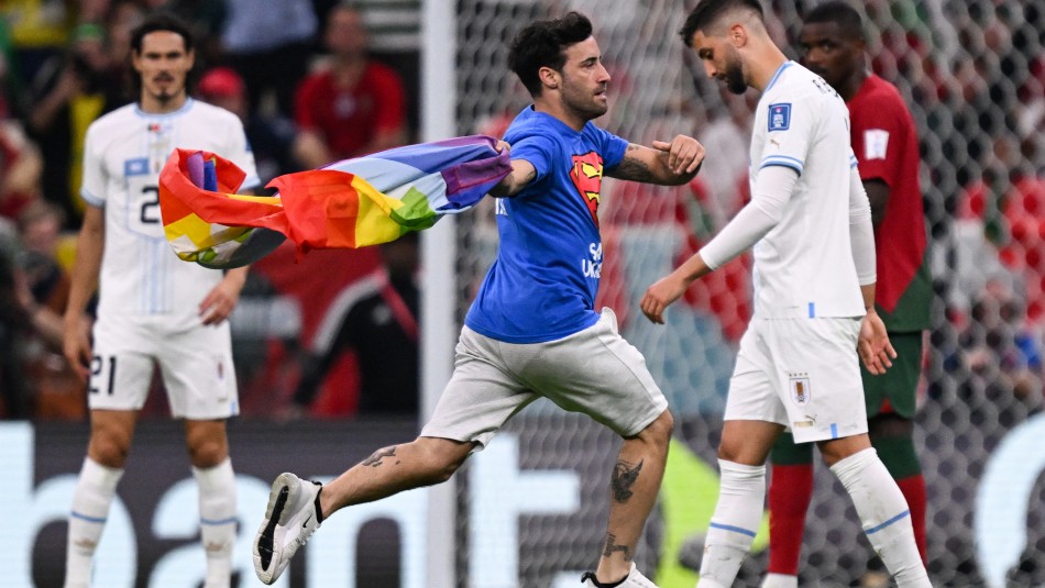 Un individuo con una bandera de las diversidades sexuales y una camiseta con un mensaje a favor de las mujeres iraníes y en contra de la invasión rusa en Ucrania penetró en el césped durante el partido entre Portugal y Uruguay disputado este lunes en el Estadio Lusail, constataron periodistas de la agencia AFP, donde el cuadro Luso ganó por 2 goles contra 0, asegurando su paso a octavos de final en Catar 2022.