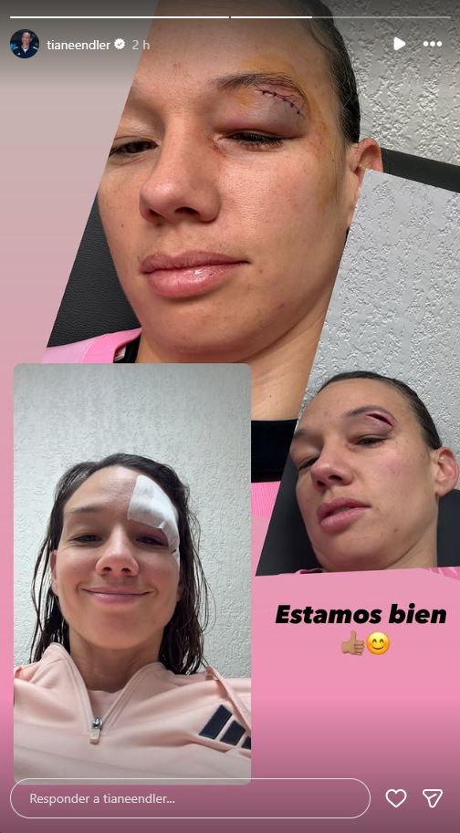 "Estamos bien", escribió Tiane Endler, adjuntado tres fotografías, donde se puede ver que recibió puntos de satura en un ojo.