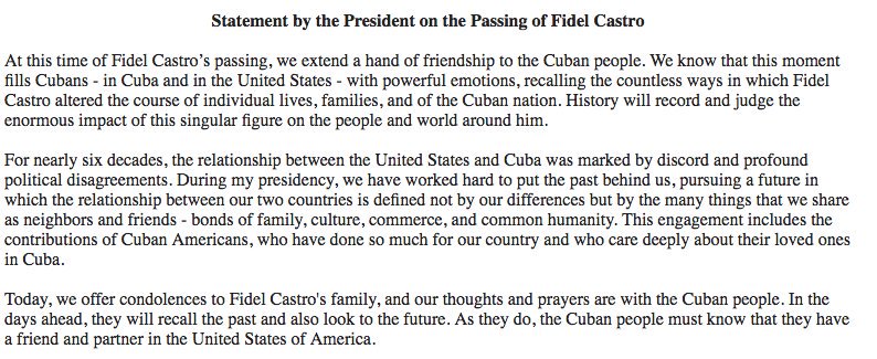 "Hoy ofrecemos nuestras condolencias a la familia de Fidel Castro, y nuestros pensamientos y oraciones están ahora con el pueblo cubano. En los días venideros, ellos recordarán el pasado y también mirarán al futuro. De acuerdo lo hagan, el pueblo cubano debe saber que tienen un amigo y compañero en los Estados Unidos", concluyó la declaración.