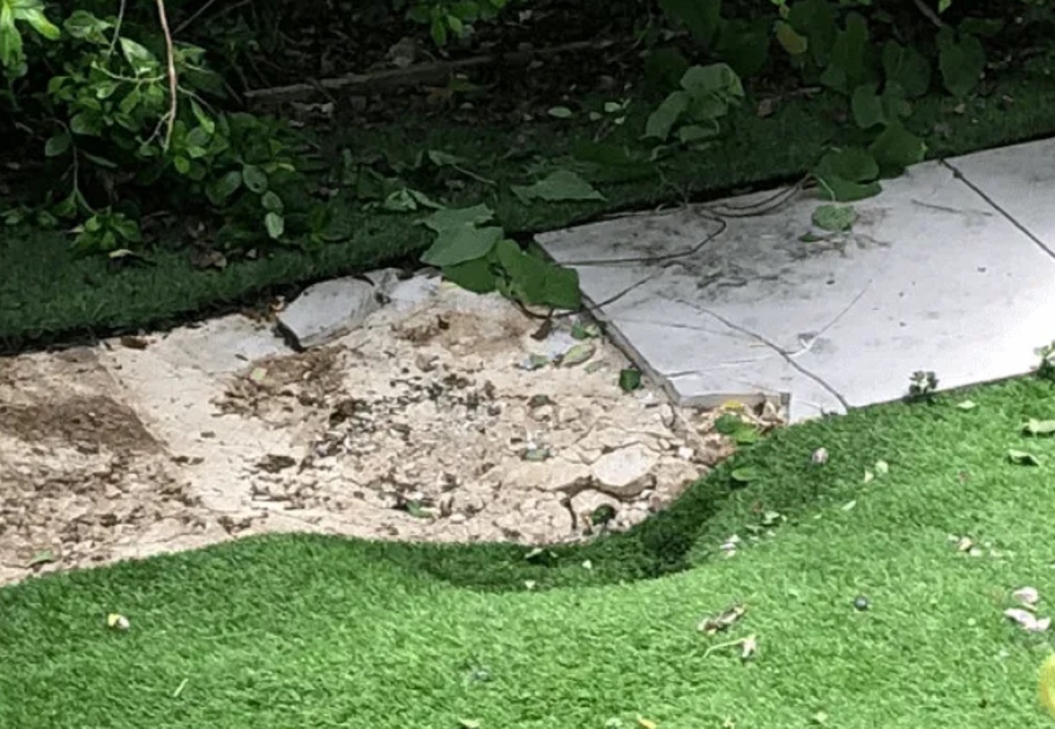 El cuerpo cayó con tal fuerza que dejó un agujero en el césped y en una losa del jardín, según una imagen publicada por el tabloide The Sun.
