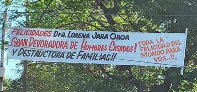 “¡Felicidades, doctora Lorena Jara Oroa! Gran devoradora de hombres casados y destructora de familias. Toda la felicidad del mundo para vos”, se leía en el aviso colocado a una altura considerable.