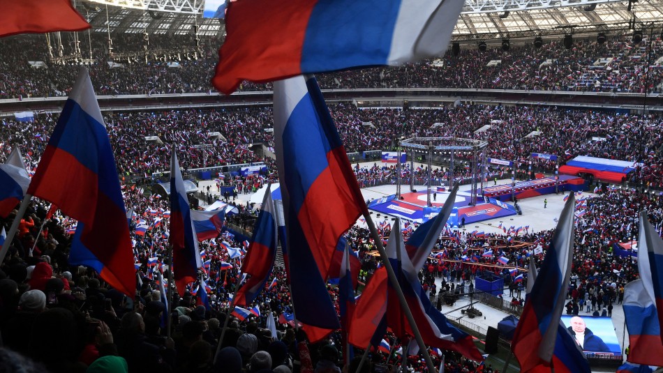 Putin estaba alabando el heroísmo de los soldados rusos desplegados en Ucrania, ante decenas de miles de personas en un estadio, cuando de repente la cadena de televisión pública rusa Rossiya-24 comenzó a mostrar otros momentos del mismo acontecimiento, discursos oficiales y canciones populares.