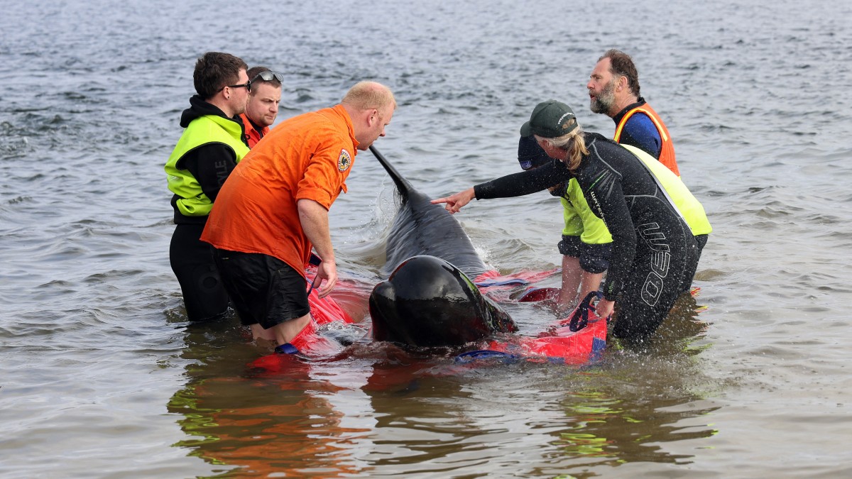 Luego de un intenso día de esfuerzos en condiciones difíciles, solo 32 de las aproximadamente 226 ballenas piloto encontradas encalladas en la playa pudieron ser rescatadas, según los servicios de vida salvaje estatales.