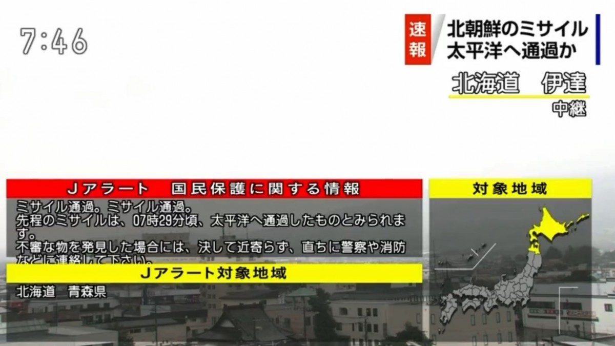 Y prosiguió con la comunicación oficial: "Basándose en el hecho de que el lanzamiento de un misil balístico que pasa sobre Japón es un acto que podría tener un grave impacto en la vida y la propiedad del pueblo de Japón (...) Se cree que el misil anterior pasó al Océano Pacífico alrededor de las 07:29. Si encuentra algo sospechoso, no se acerque y comuníquese inmediatamente con la policía o los bomberos".