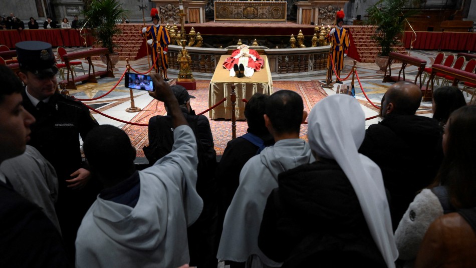 Los fieles entran en silencio por el pasillo central del templo católico más grande del mundo, la mayoría fotografiando con sus móviles el cuerpo del expapa, quien ha sido vestido de blanco con una casulla roja, el color del luto papal, con una mitra blanca adornada con un borde dorado y un rosario entrelazado en sus manos. Su rostro resulta casi irreconocible.