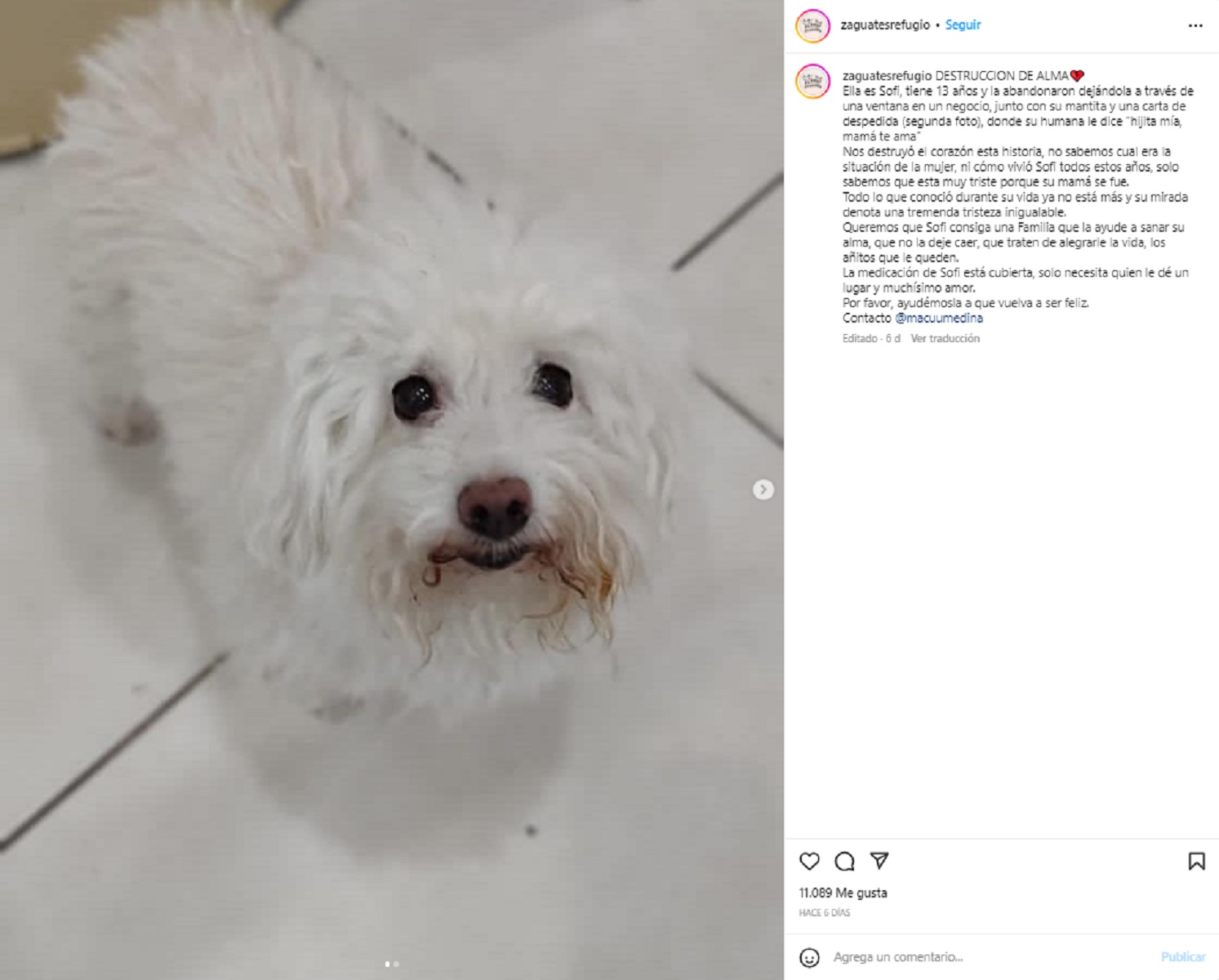 Días más tarde, señalaron que "no tenemos los datos de esta mujer, pero la tristeza de Sofi nos impulsa a empezar la búsqueda de su humana para que vuelvan a reencontrarse y entre todos ayudarla para que no vuelva a faltarle nada". A los seguidores se les solicitó compartir el posteo para llegar, eventualmente, a la dueña.