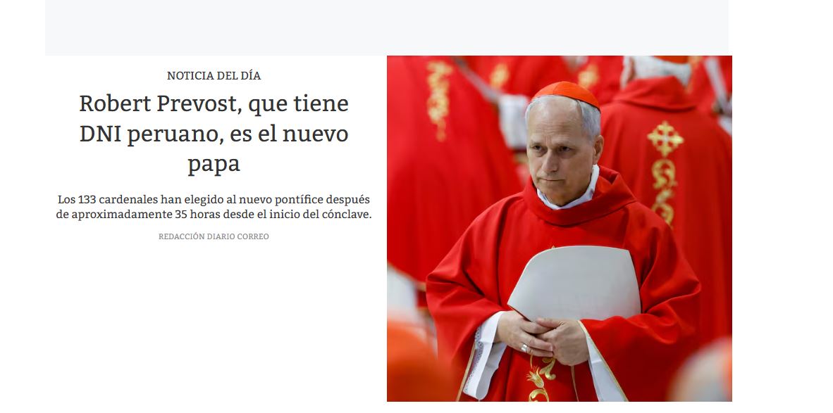 El diario Correo, en tanto, subrayó la noticia de la siguiente manera: "Robert Prevost, que tiene DNI peruano, es el nuevo papa".