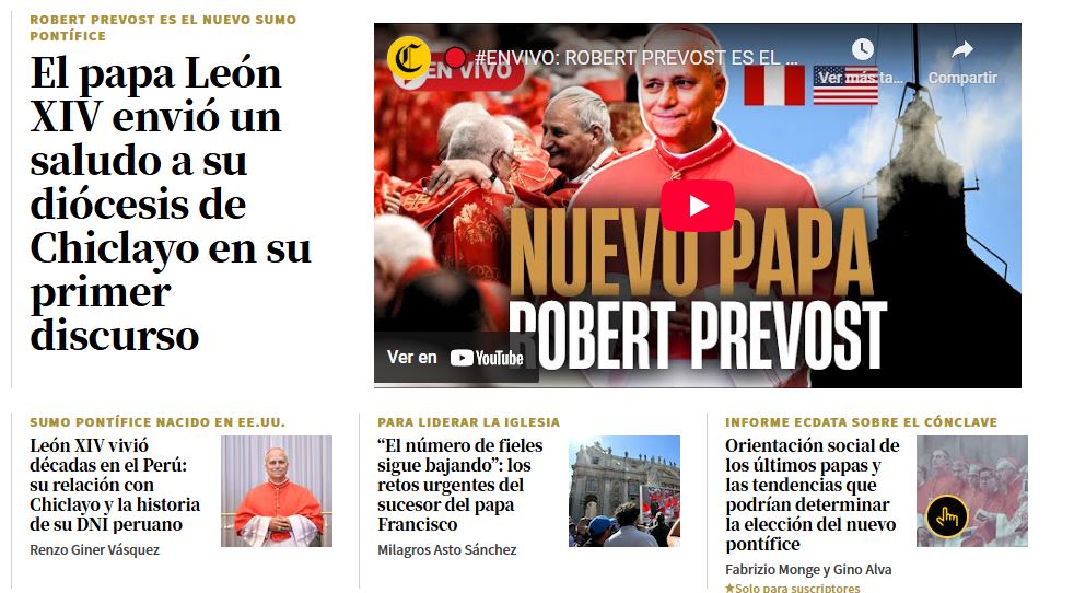 El Comercio, uno de los medios más importantes del vecino país, apuntó que "Robert Prevost, cardenal estadounidense y con nacionalidad peruana, es el nuevo papa de la Iglesia".