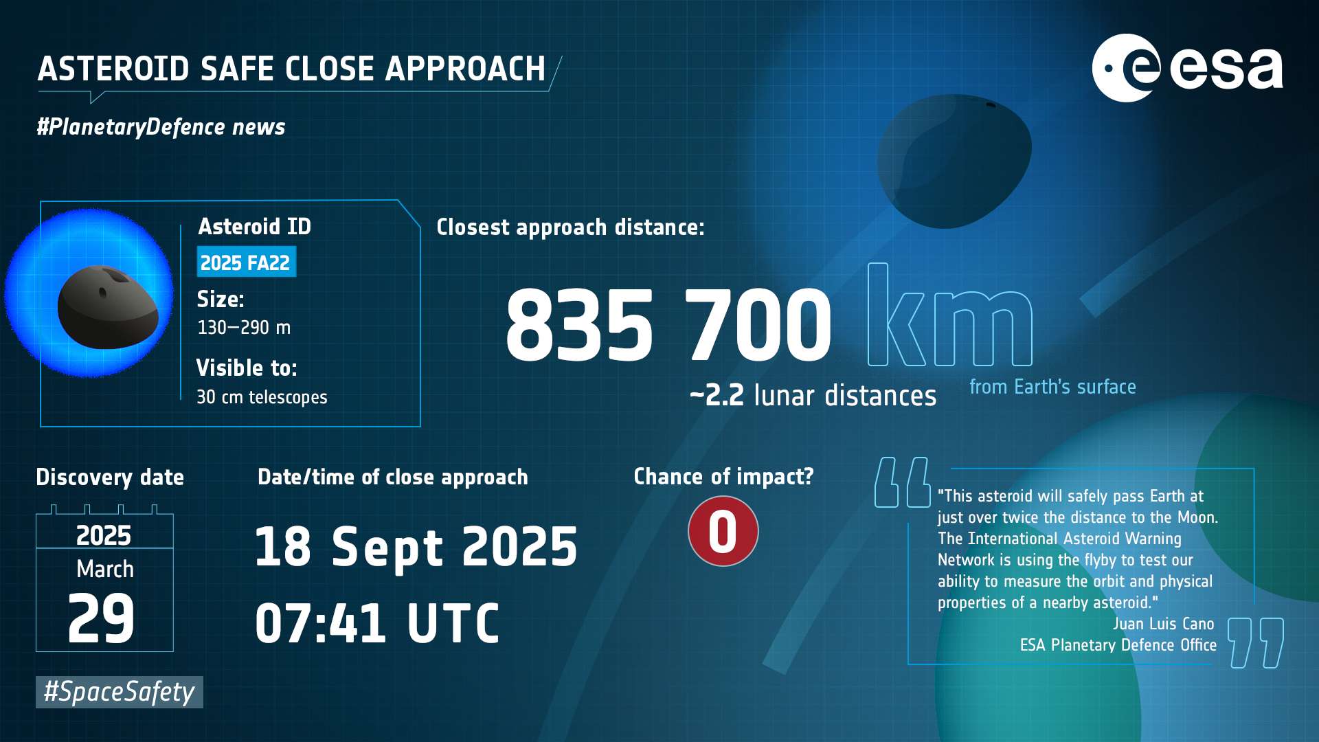 La Agencia Espacial Europea (ESA) informó que el asteroide 2025FA22, una roca espacial de entre 130 y 290 metros de diámetro, pasará cerca de la Tierra este jueves 18 de septiembre, específicamente a unos 835 mil kilómetros de distancia, lo que representa poco más del doble del trecho que separa a la Luna de nuestro planeta.