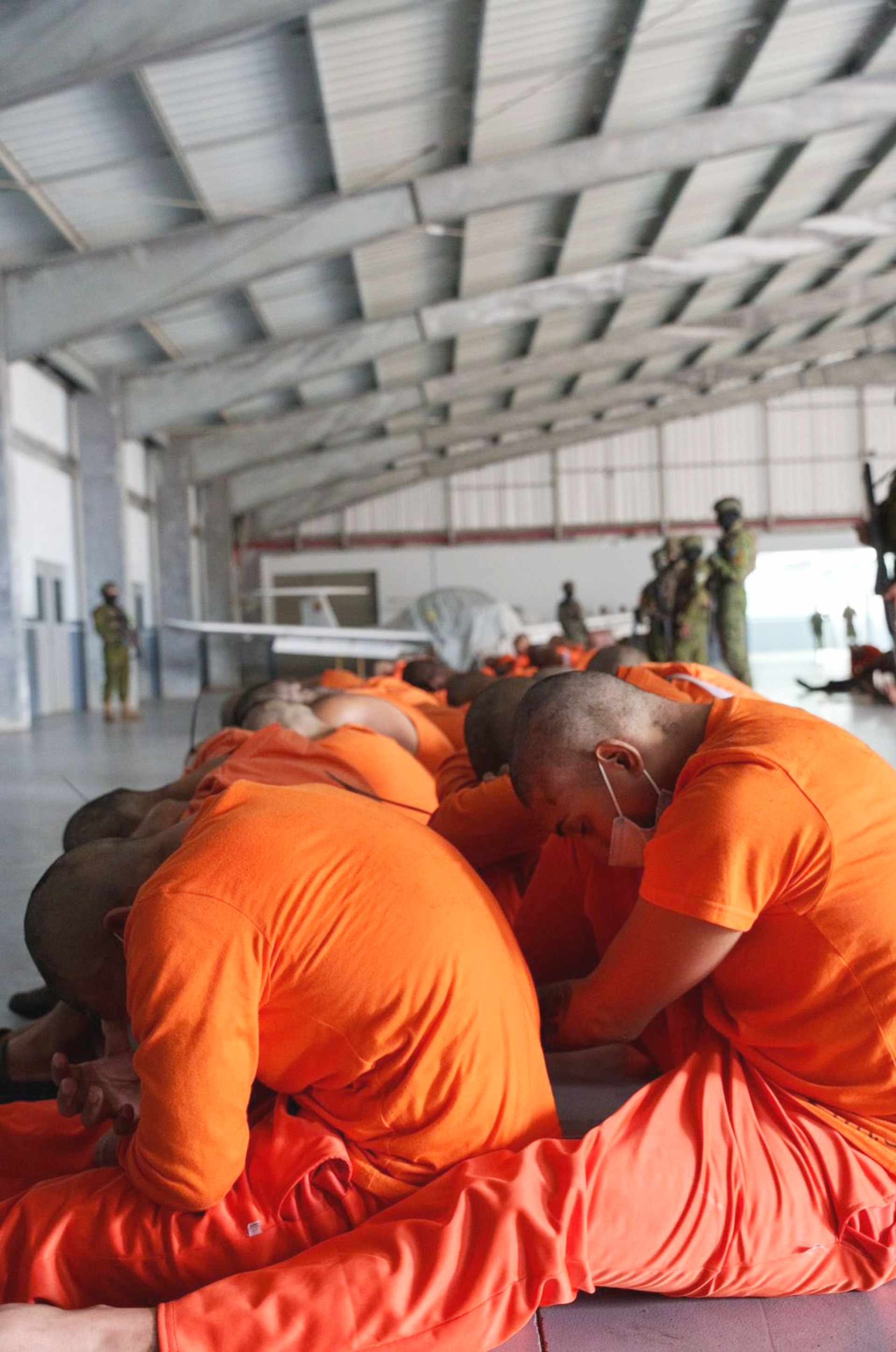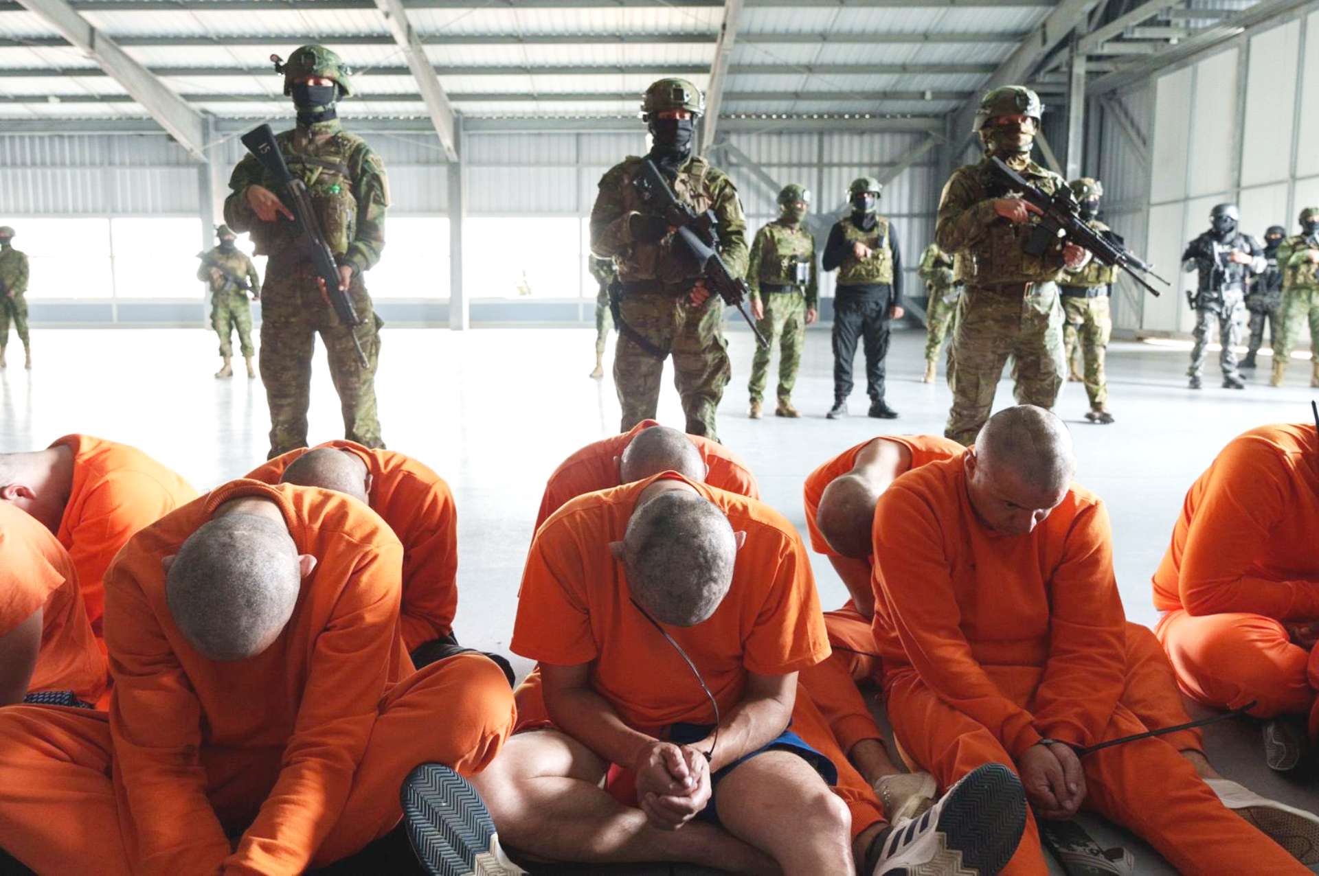 De uniforme naranja, manos atadas y con la cabeza rapada mirando al piso, una veintena de detenidos aparecen sentados en el suelo y rodeados de militares de rostro cubierto, según imágenes difundidas por el mandatario en X.