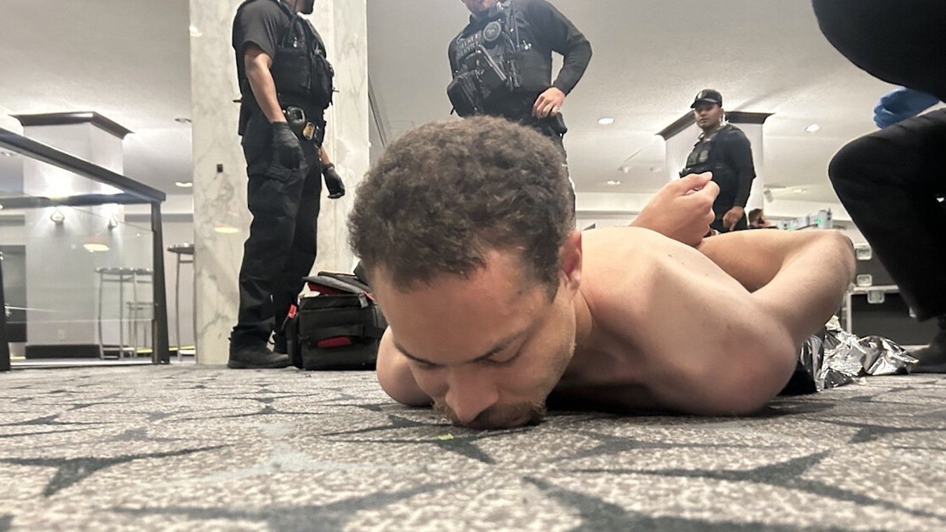 Tras un breve intercambio de disparos con los agentes, fue detenido en el lugar. Trump publicó fotos del hombre esposado en la alfombra del hotel, sin camisa y tendido boca abajo.