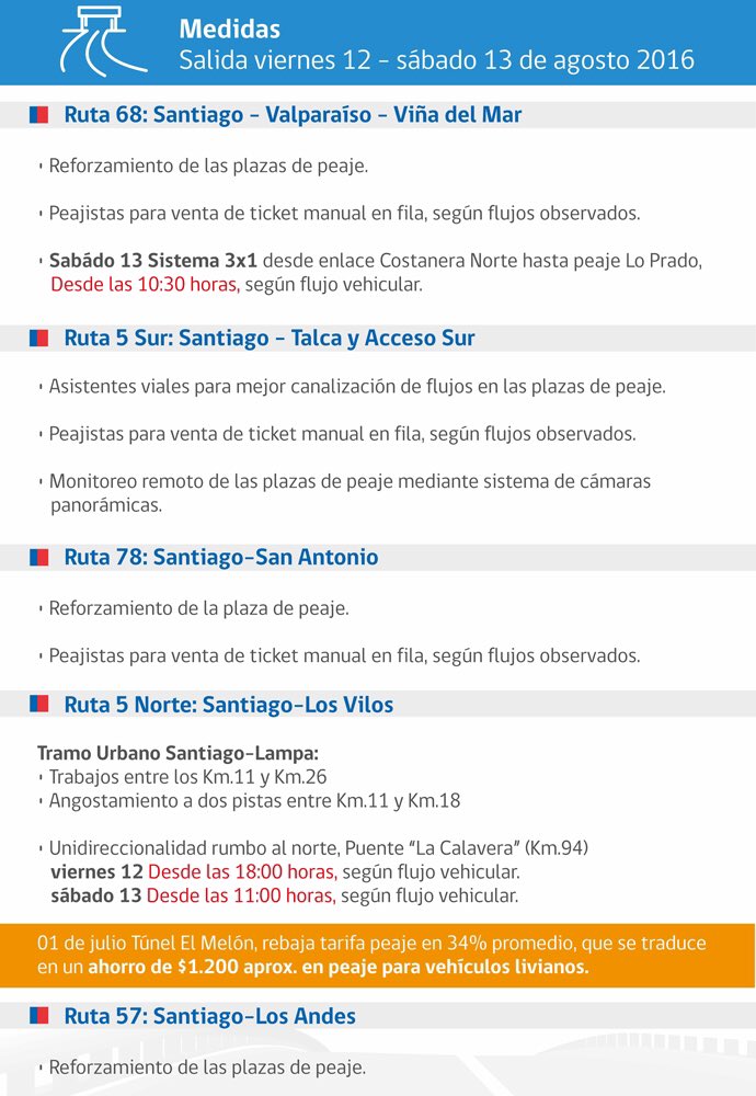 El Ministro de Obras Públicas, Alberto Undurraga, anunció la aplicación de un Plan de Contingencia Vial en carreteras de acceso a Santiago, con motivo del fin de semana largo que va del viernes 12 al lunes 15 de agosto, período en que se proyecta salgan unos 320 mil vehículos de la capital.