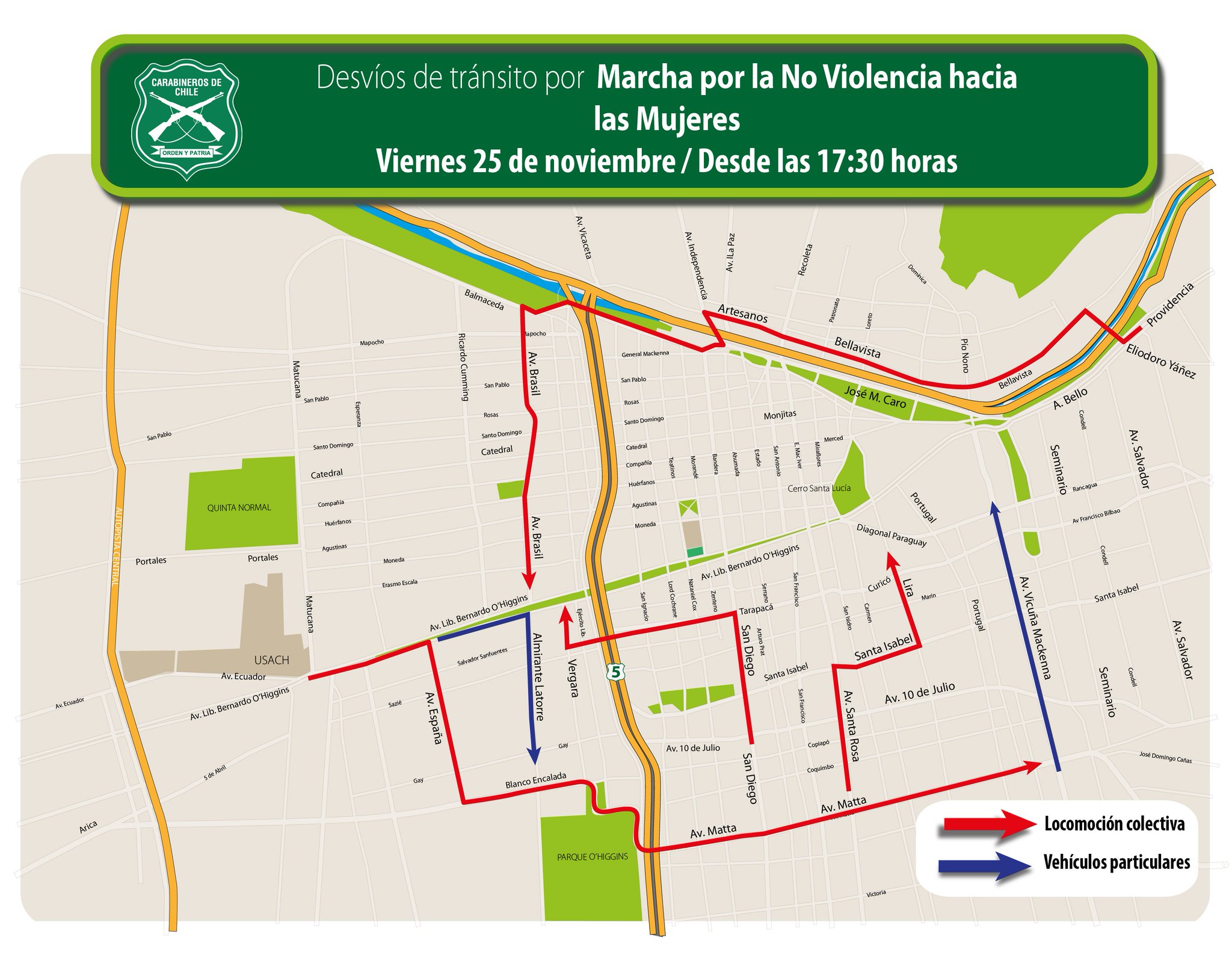 Por lo tanto, Carabineros informó de los desvíos que hay en las calles producto de la movilización.