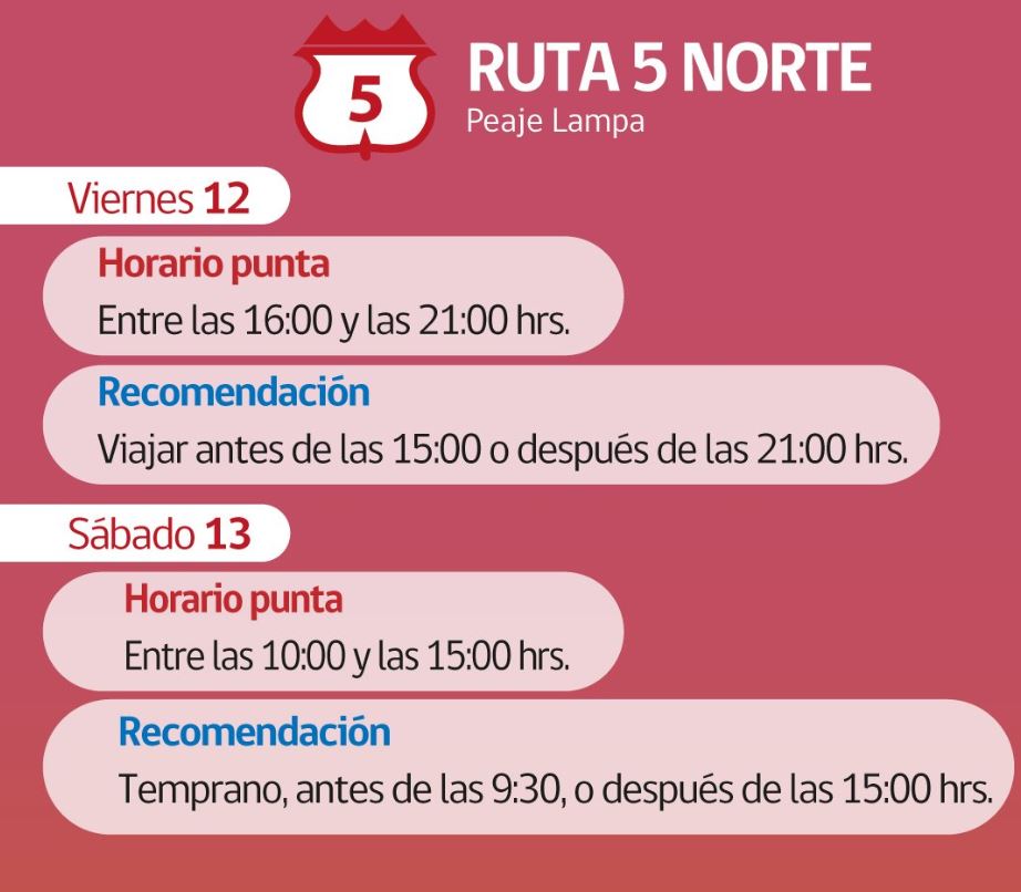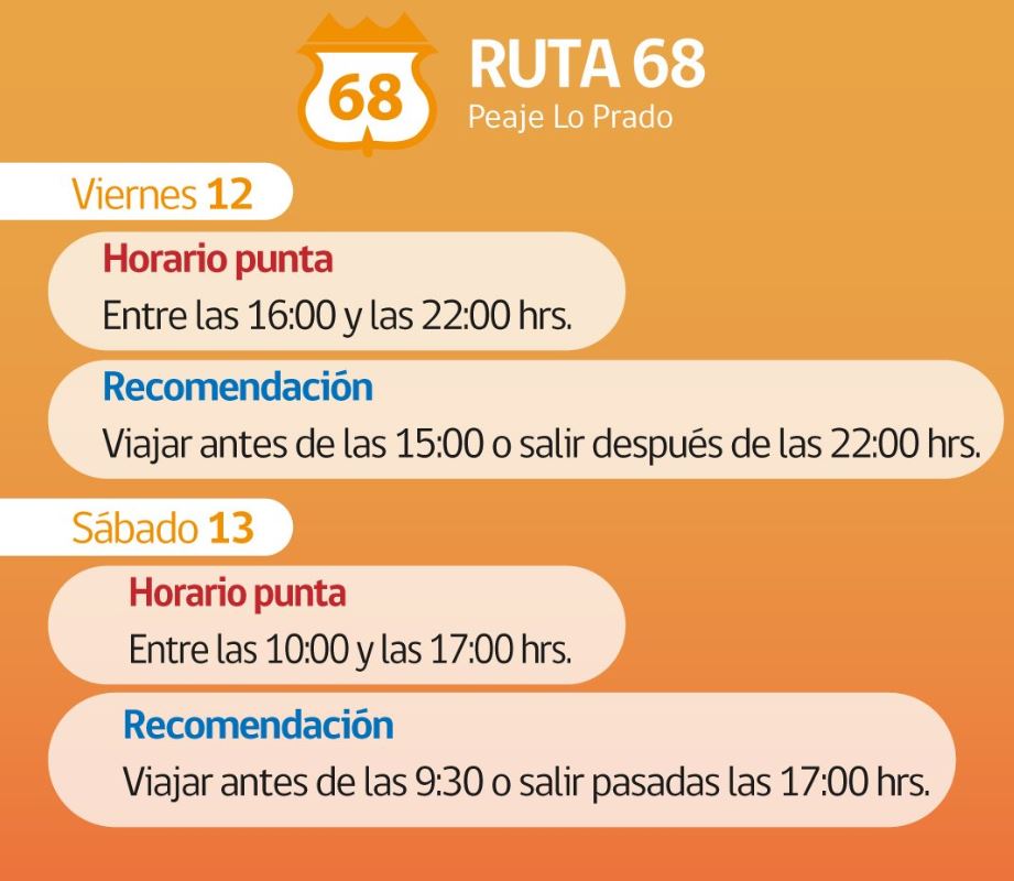 La información es para la Ruta 5 Sur, Ruta 68, Ruta 78 y 5 norte.