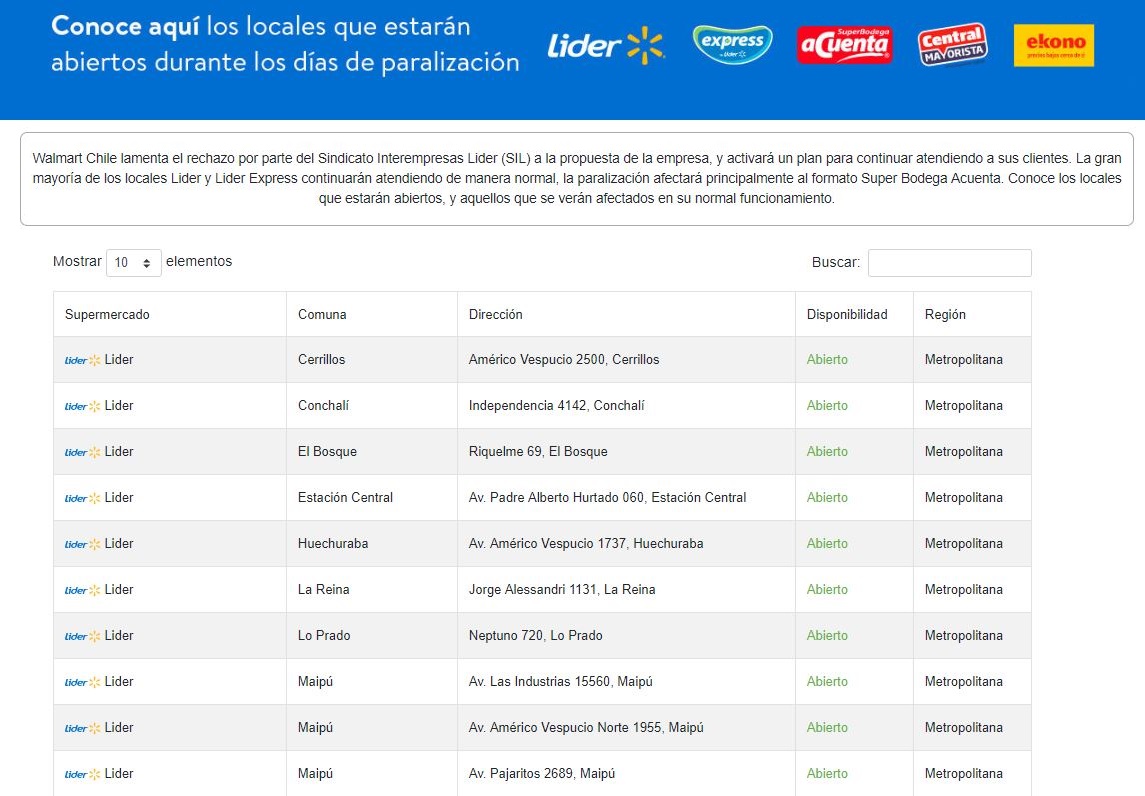 Sin embargo, los locales comerciales funcionarían con horarios especiales durante esta jornada. En el caso de los supermercados Lider, Lider Express, Acuenta, Central Mayorista y Ekono no todas sus sucursales estarán abiertas debido a la huelga que mantienen los trabajadores de Walmart.
