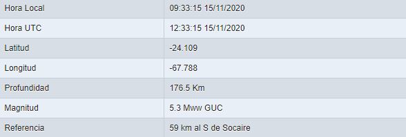 De acuerdo con lo señalado por el Centro Sismológico Nacional, este movimiento telúrico se produjo a las 09:33 horas y, en primera instancia, tuvo una magnitud de 5.5 grados que luego fue corregida a 5.3 grados.