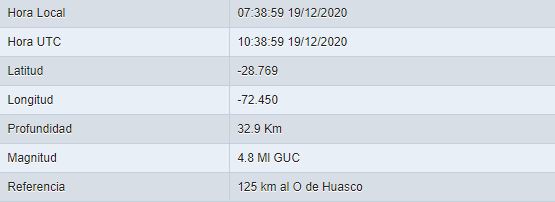 Según lo reportado por el Centro Sismológico Nacional, el sismo se produjo a 125 kilómetros al oeste de la comuna de Huasco, en la región de Atacama.