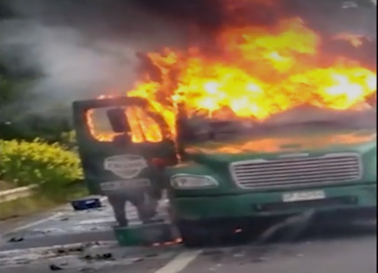 Los desconocidos, tras obligar al conductor a dejar el vehículo de carga, procedieron a prenderle fuego, mientras que también se reportaron disparos en la zona.