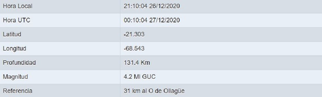 Hora Local: 2020/12/26 21:10:04 Mag: 4.2, Lat: -21.303, Lon: -68.543, Prof: 131.4, Loc: 31 km al O de Ollagüe