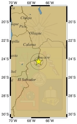 De acuerdo a los datos entregados por el organismo, el epicentro se ubicó 105 km al sureste de Socaire, en la Región de Antofagasta, por lo que su origen está ubicado en Argentina. La profundidad del sismo fue de 208.2 km.
