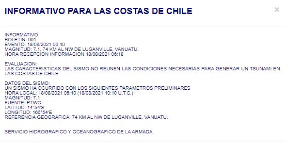 No obstante la situación en Chile, el Servicio Geológico de Estados Unidos (USGS) informó sobre una alerta de tsunami que fue emitida este miércoles tras un terremoto en las costas de Vanuatu.