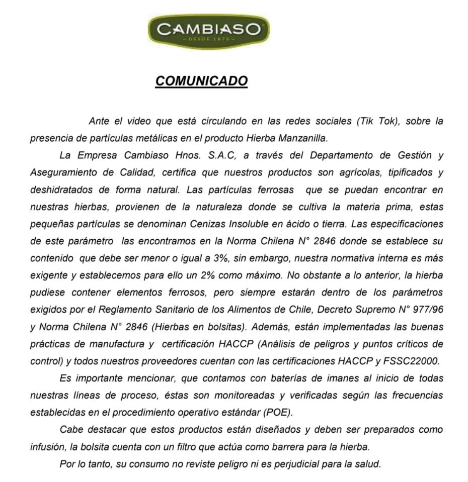 “La empresa Cambiaso Hnos. S.A.C, a través del Departamento de Gestión y Aseguramiento de Calidad, certifica que nuestros productos son agrícolas, tipificados y deshidratados de forma natural. Las partículas ferrosas que se pueden encontrar en nuestras hierbas, provienen de la naturaleza donde se cultiva la materia prima”, dice el comunicado.