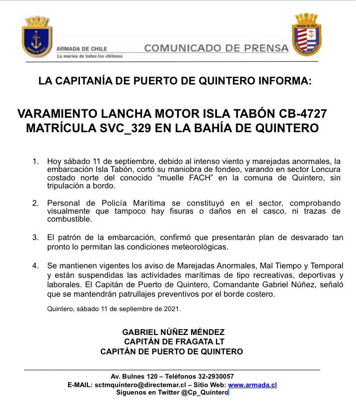 No había dotación en la embarcación y no se registra contaminación, dueños de la lancha procederán a retirarla una vez mejoren las condiciones meteorológicas.#ArmadaTeCuida pic.twitter.com/0sHbUqVTsN