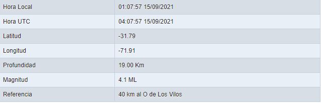 En la madrugada de este miércoles 15 de septiembre, a las 01:07 horas, un sismo de magnitud 4.1 en la escala de Richter afectó a la zona centro norte del país, según informó el Centro Sismológico de la Universidad de Chile.