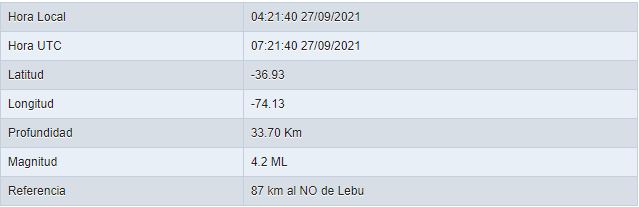 Hora Local: 2021/09/27 04:21:40, mag: 4.4, Lat: -36.92, Lon: -74.0, Prof: 13.5, Loc : 70.31 km al NO de Arauco