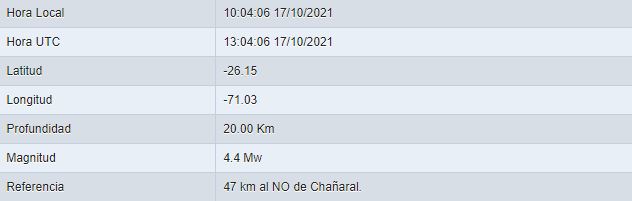 Según lo reportado por el Centro Sismológico Nacional, el temblor se produjo a 47 kilómetros al noroeste de Chañaral, en la región de Atacama.