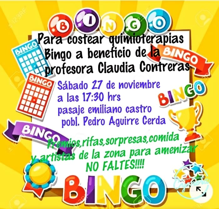 El bingo en beneficio para el tratamiento de la profesora Claudia Contreras, será el realizado el próximo sábado 27 de noviembre en el pasaje Emiliano Castro de la Población Pedro Aguirre Cerda, en la comuna de San Felipe, región de Valparaíso.