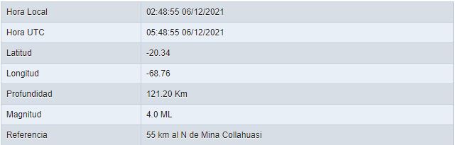 Hora Local: 2021/12/06 02:48:55, mag: 4.0, Lat: -20.34, Lon: -68.76, Prof: 121.2, Loc : 55.42 km al N de Mina Collahuasi