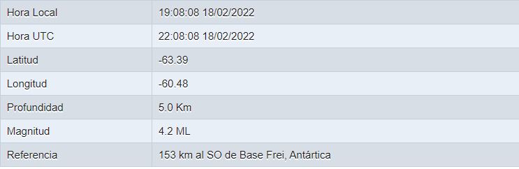 El epicentro del temblor se produjo a 153 kilómetros al suroeste de la Base Frei, en el territorio chileno antártico.