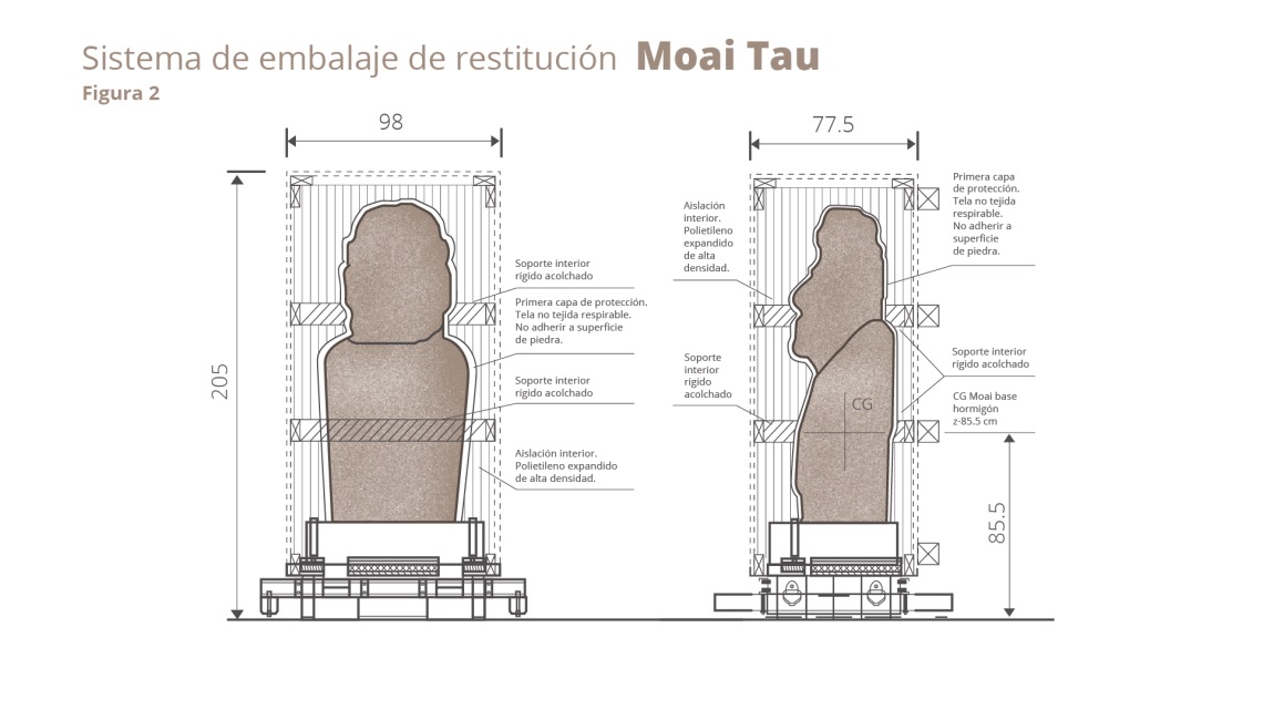 Al llegar a la zona de embalaje, el moai se cubrirá con una primera capa de protección, una tela no tejida respirable, que no se adherirá a la superficie de la piedra. Además, su caja contará con un soporte interior rígido y acolchado, y con una aislación interior.