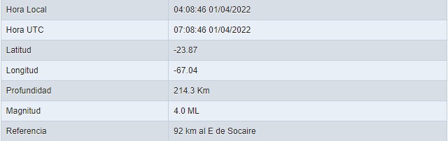De acuerdo a los datos entregados por el organismo, el epicentro se ubicó 92 km al este de Socaire, en la Región de Antofagasta, con una profundidad de 214.3 km.
