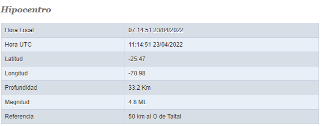 De acuerdo a los datos entregados por el organismo, el epicentro se ubicó 50 km al Oeste de Taltal, en la región de Antofagasta, con una profundidad de 33,2 km.