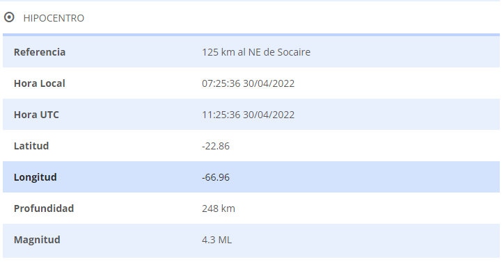 Hora Local: 2022/04/30 07:25:36, mag: 4.3, Lat: -22.86, Lon: -66.96, Prof: 248.2, Loc : 125.48 km al NE de Socaire
