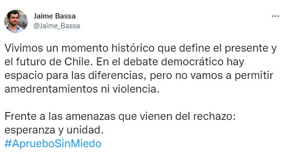 Al respecto, uno de los exconstituyentes víctima de estas amenazas, Jaime Bassa, utilizó su cuenta de Twitter para referirse al tema, asegurando que "vivimos un momento histórico que define el presente y el futuro de Chile. En el debate democrático hay espacio para las diferencias, pero no vamos a permitir amedrentamientos ni violencia".